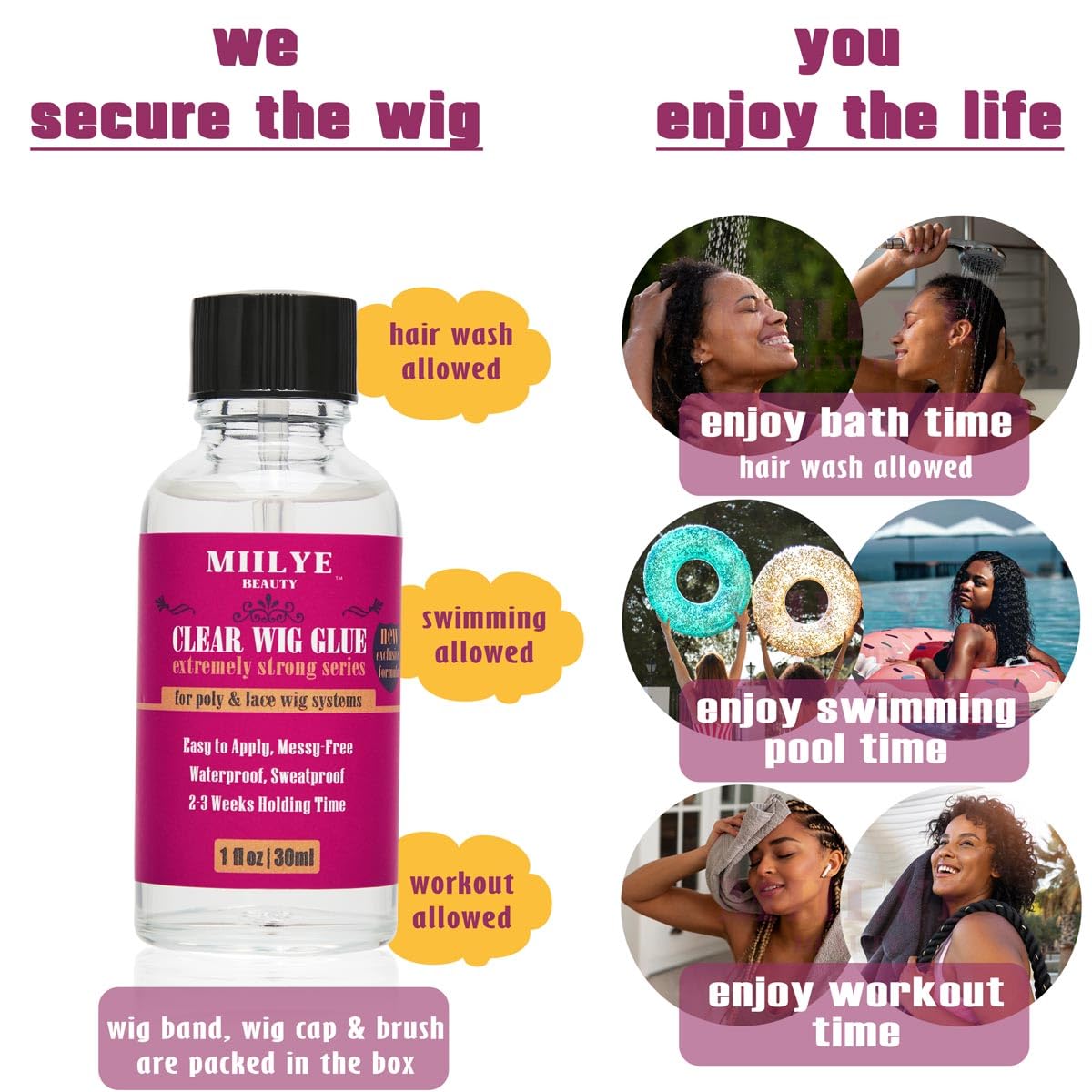 “Glue Down. Dive In. Stay Flawless – No Lift, No Leak, Just Lock.” Get extreme hold with this Clear Wig Bond Glue Kit (1oz glue + 1oz remover). Waterproof, swim-allowed, and invisible. Includes wig band & caps. Perfect for lace fronts, frontals, and daily wear — strong, safe, and totally secure.