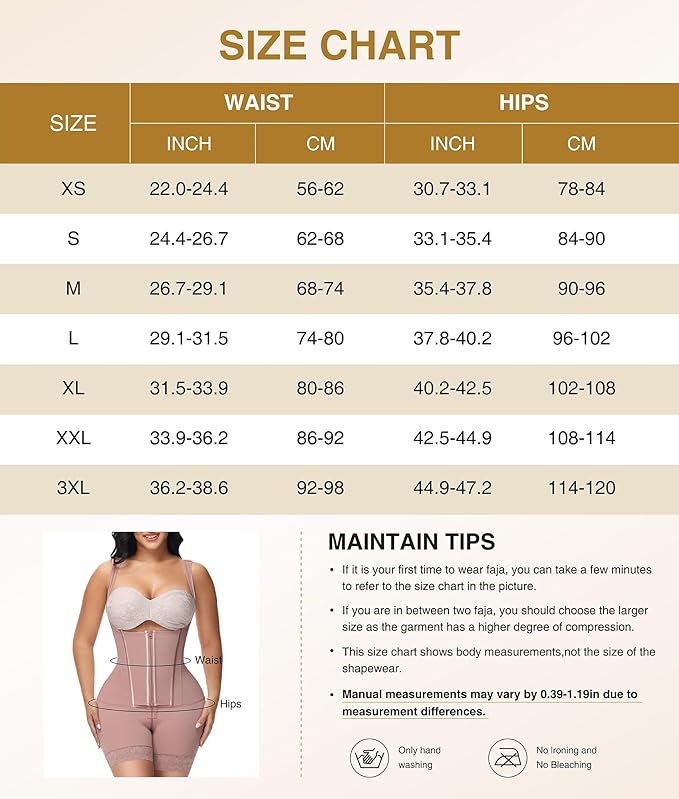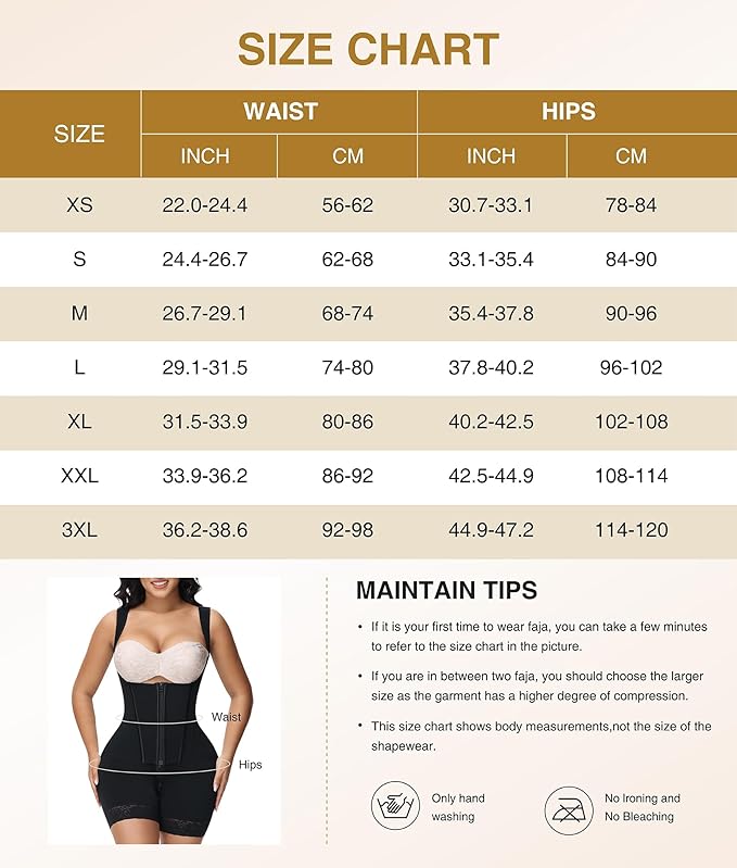 Measure waist (navel level) and hips (widest part) after surgery (swelling considered). Size up if between measurements to avoid excessive pressure on healing tissues.